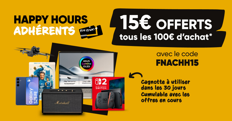 - Adhérents Fnac, 15€ Offerts tous les 100€ d'achat avec le code "FNACHH15" ! Valable du Mardi 7 Octobre 19h00 au Mercredi 8 Octobre 09h00